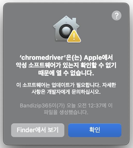 ‘chromedriver’은(는) Apple에서 악성 소프트웨어가 있는지 확인할 수 없기 때문에 열 수 없습니다.