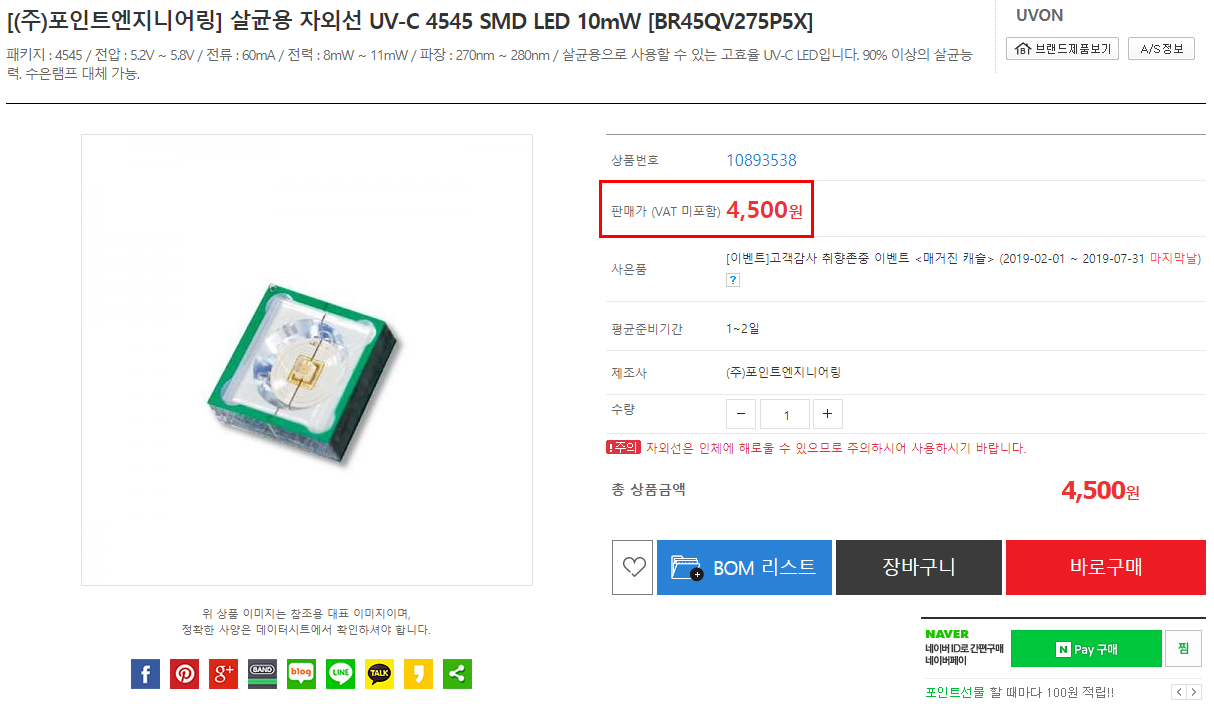 그렇다면 과연 어떻게 만들어야 할까. UV-C LED를 사용해서 만들어볼까? 하는 마음으로 UV-C LED를 구하려 봤지만 판매하는 업체 자체가 극히 적은데다가 칩 하나당 약 4500원의 고가였다. 반면 UV-A LED는 50cm 30구 LED바가 약 5천원, 아 이거 참 비교가 많이 되는구나.
