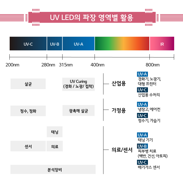 위에서 구매한 상품도 그렇고 자작하려던 UV LED도 그렇고. 일단 UV가 무엇인가에 대해서 공부를 하기 시작했었는데 내가 알 지 못했던 많은 부분이 눈에 띄게 되었다. 일단 UV는 크게 세 종류로 구분이 된다.