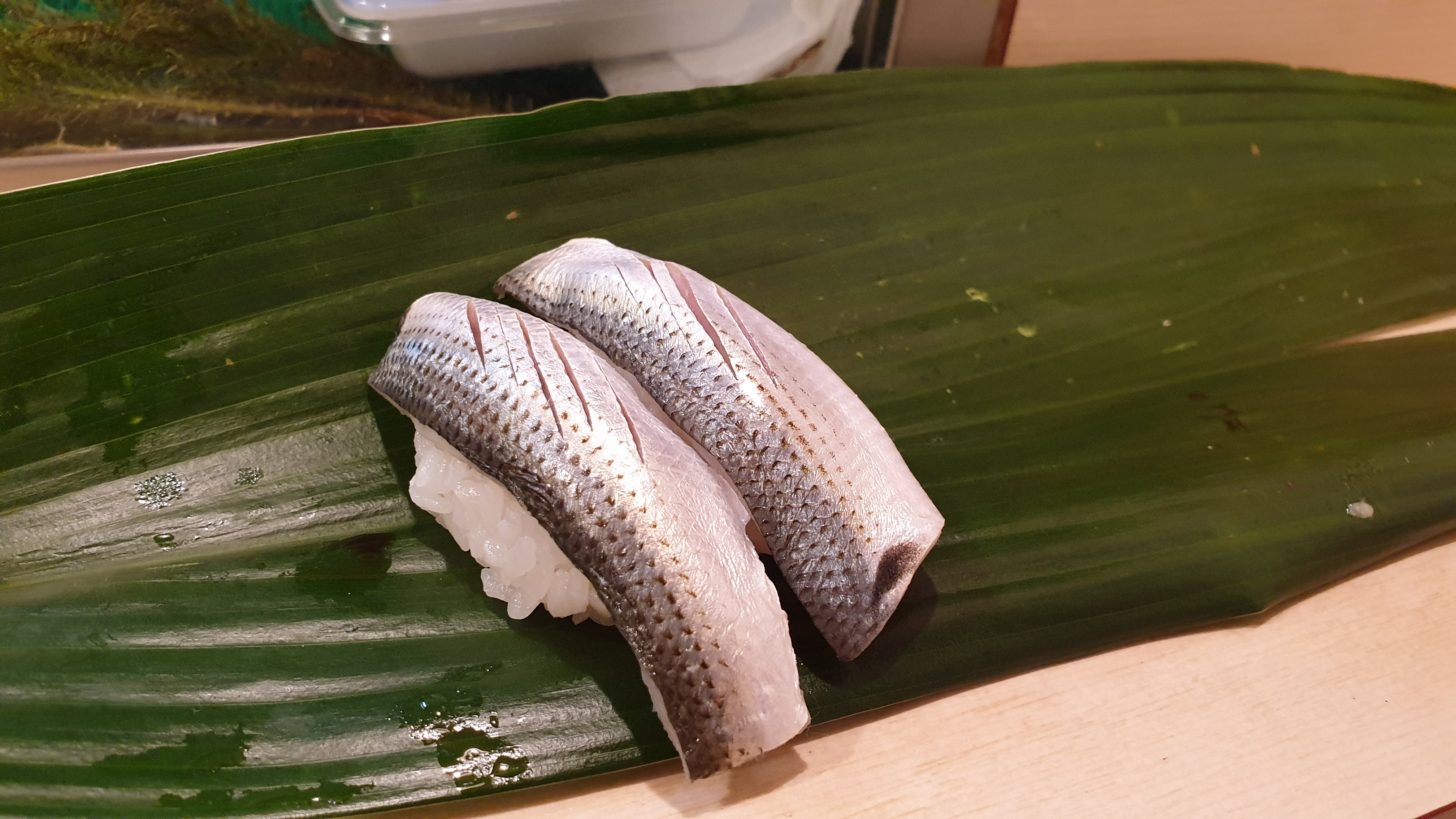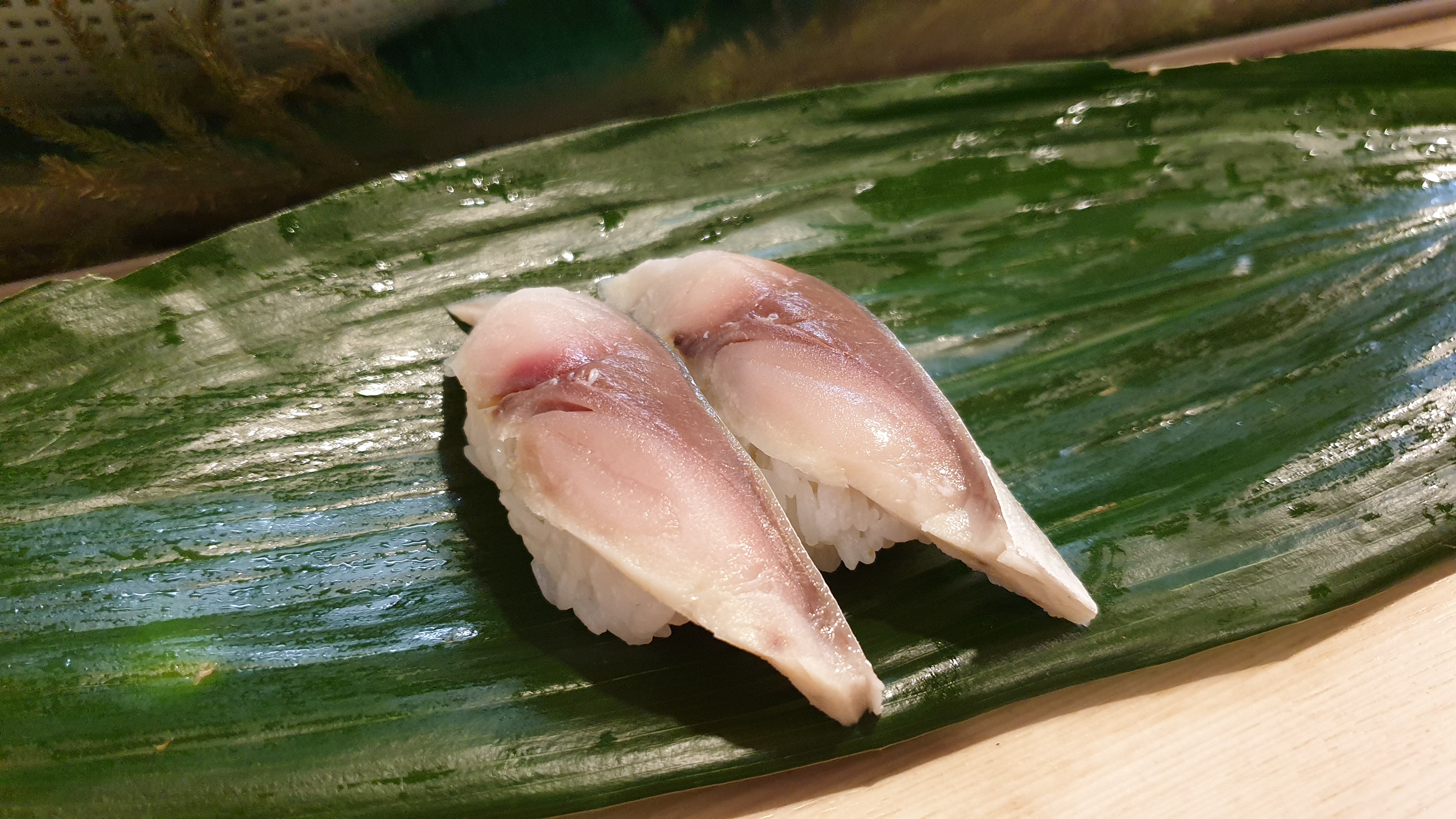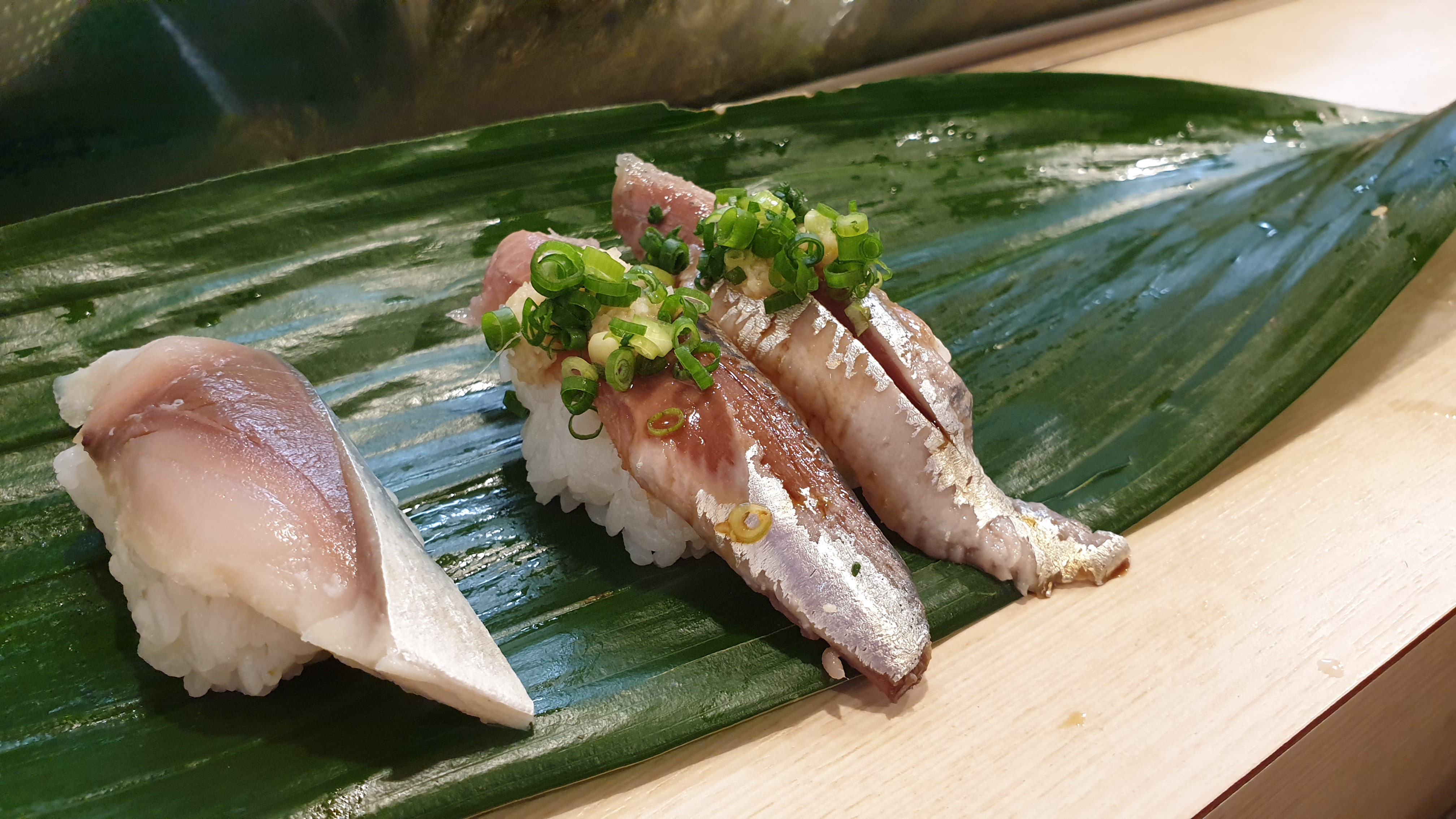 오른편의 초밥은 전갱이 초밥이다. 이 또한 생강이 아주 잘 어울리는 초밥이었다. 그냥 먹기 비린 초밥들은 생강이 같이 올라가는데, 생강과 이리 잘 어울릴줄은 꿈에도 몰랐다.